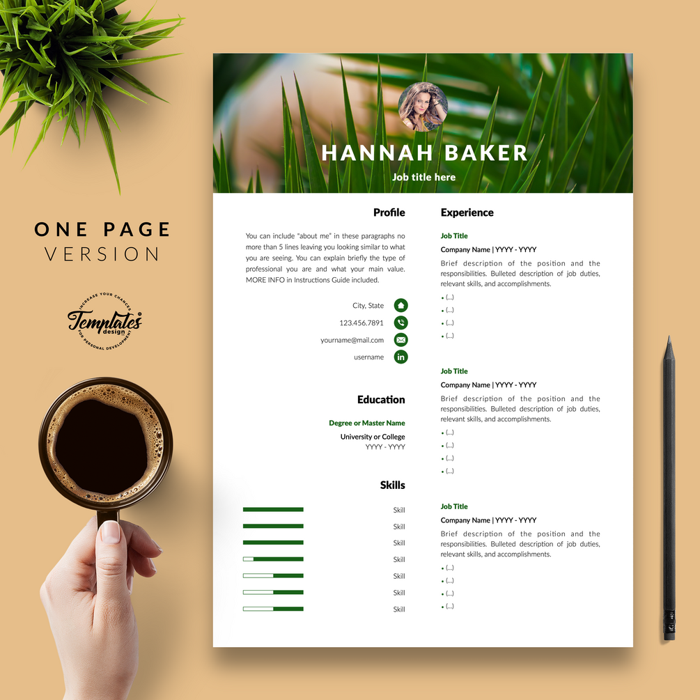 Creative and Modern Resume Template perfect for job positions as Safari Assistant, Biologist, or Research Assistant. CV Templates editable with Microsoft Word & Apple Pages that include US Letter Size Files and A4 Size Files; One, Two, and Three Page Version, Cover Letter Template, References Letter Template, Cover Letter with References Template, Fonts, Icon Set + Instructions Guide for Resume Design + Self-Knowledge and Development Questionnaire. Curriculum Vitae Instant Download.