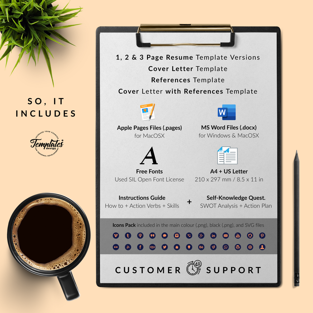 Creative and Professional Resume Template perfect for any job positions. Original CV Template for Microsoft Word & Apple Pages that include US Letter Size Files and A4 Size Files; One, Two, and Three Page Resume, Cover Letter Template, References Letter Template, Cover Letter with References Template, Fonts, Icon Set + Instructions Guide for Resume Design + Self-Knowledge and Development Questionnaire. Resume Downloadable.
