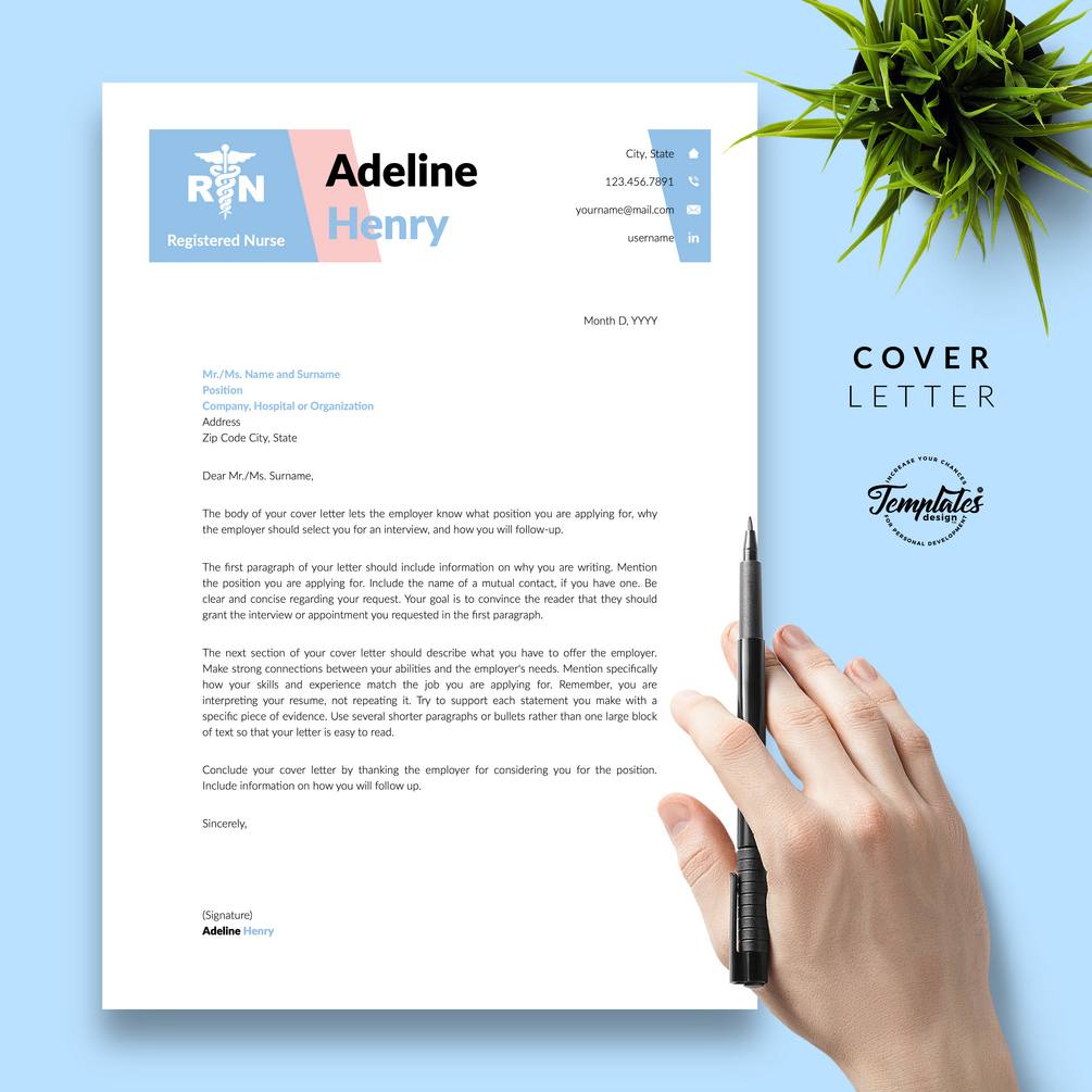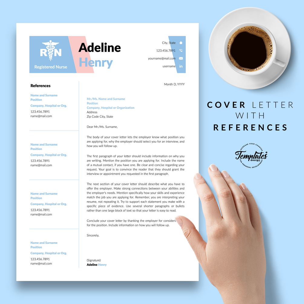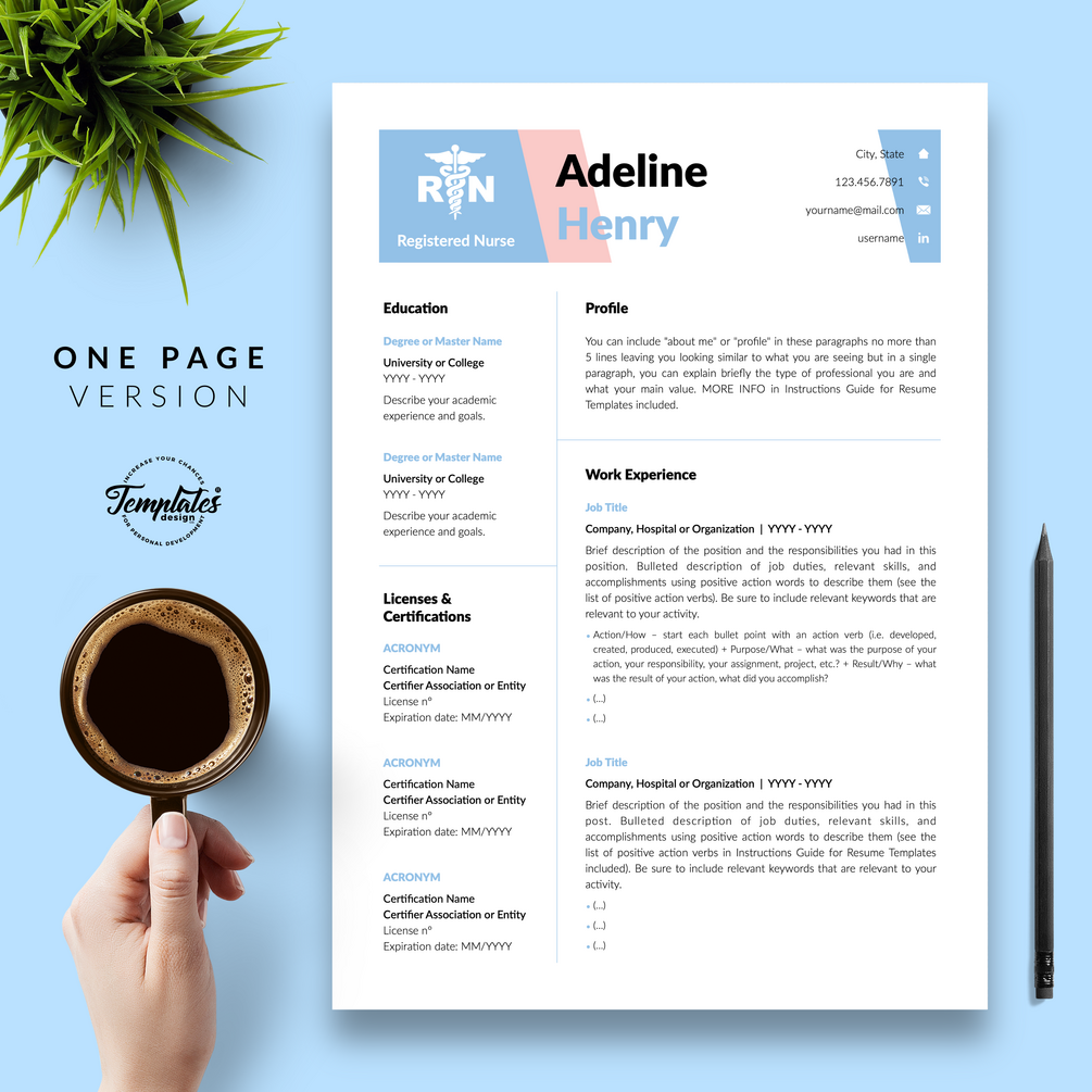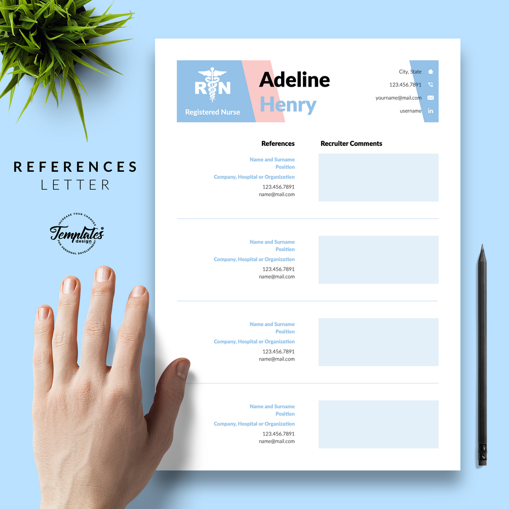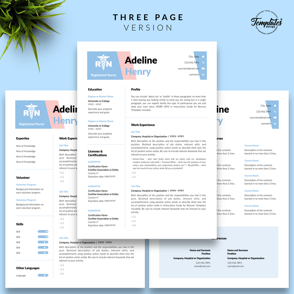 "Adeline Henry" Nurse Resume CV Template for Word & Pages / US Letter & A4 Files + 1, 2, & 3 Page Resume Version + Cover Letter + References + Cover Letter with References + Fonts + Icons + Resume Writing Guide/Tips + Bonus / Instant Download