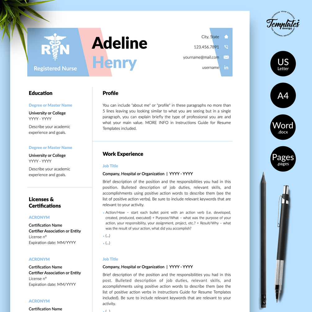 Registered Nurse Resume Template RN perfect for job positions as Nurse Graduate, Student Nurse, Experienced Nurse, Nurse Practitioner, Nursing, or Doctor. Medical, Registered Nurse CV Template for Microsoft Word & Apple Pages that include US Letter Size Files and A4 Size Files; One, Two, and Three Page Resume, Cover Letter Template, References Letter Template, Cover Letter with References Template, Fonts, Icon Set + Instructions Guide for Resume Design + Self-Knowledge and Development Questionnaire. Nursing CV Instant Download.