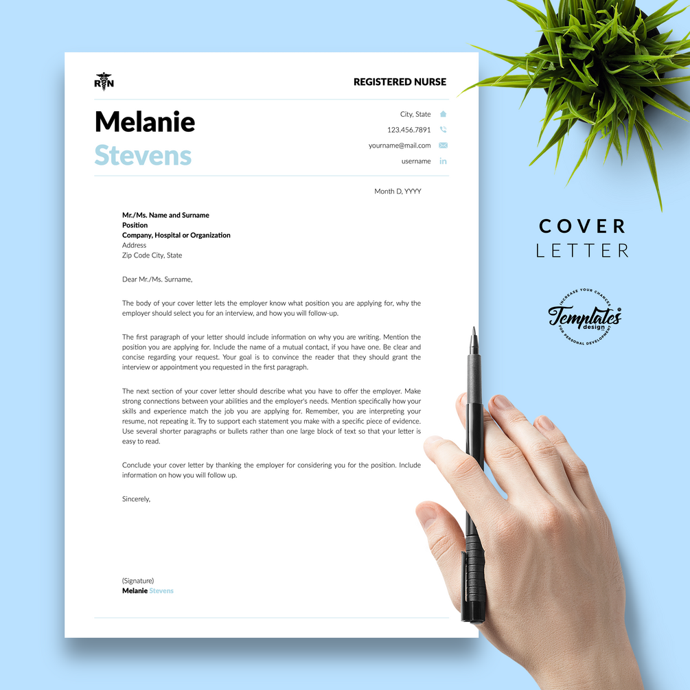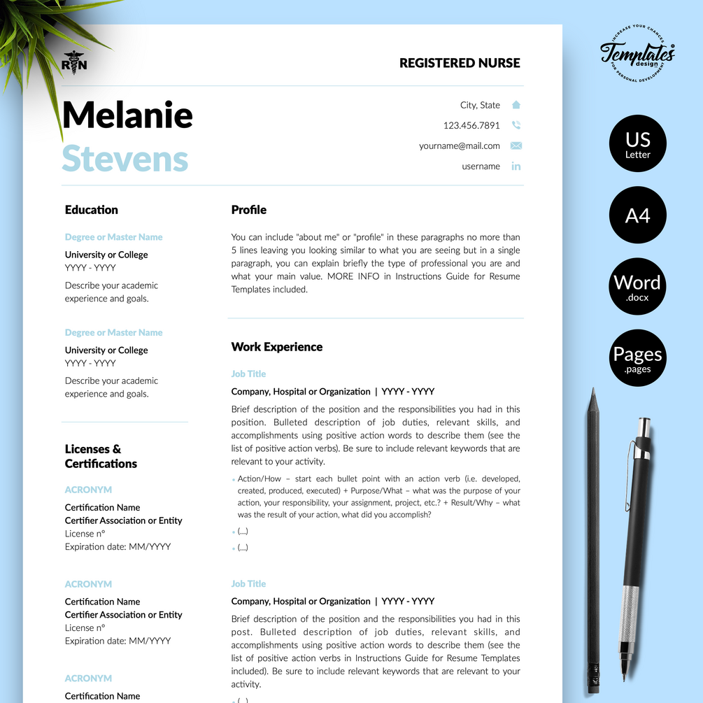 Registered Nurse Resume Template RN perfect for job positions as Nursing Graduate, Student Nurse, Experienced Nurse, Certified Assistant, Nurse Practitioner, Nursing, or Doctor. Medical, Creative Nurse CV Template for Microsoft Word & Apple Pages that include US Letter Size Files and A4 Size Files; One, Two, and Three Page Curriculum Vitae, Cover Letter Template, References Letter Template, Cover Letter with References Template, Fonts, Icon Set + Instructions Guide for Resume Design + Self-Knowledge and Development Questionnaire. Instant Download.