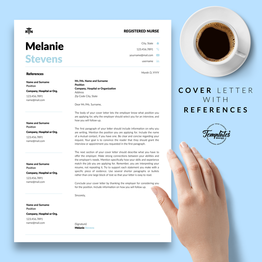 "Melanie Stevens" Nurse Resume CV Template for Word & Pages / US Letter & A4 Files + 1, 2, & 3 Page Resume Version + Cover Letter + References + Cover Letter with References + Fonts + Icons + Resume Writing Guide/Tips + Bonus / Instant Download