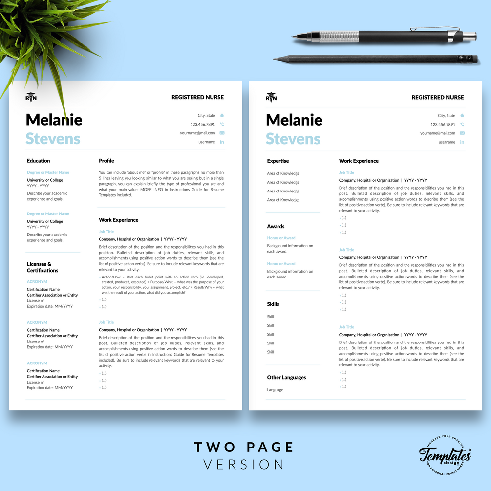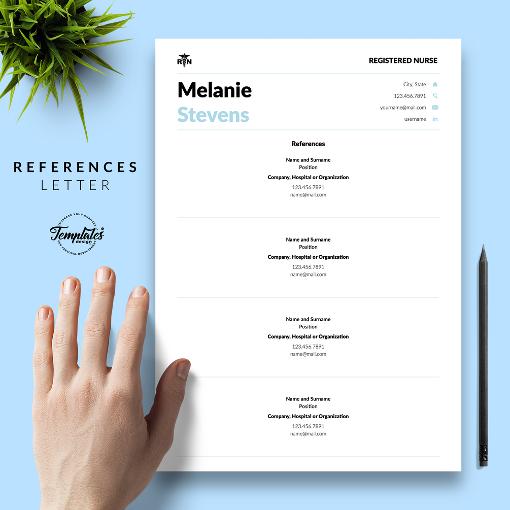 Registered Nurse Resume Template RN perfect for job positions as Nursing Graduate, Student Nurse, Experienced Nurse, Certified Assistant, Nurse Practitioner, Nursing, or Doctor. Medical, Creative Nurse CV Template for Microsoft Word & Apple Pages that include US Letter Size Files and A4 Size Files; One, Two, and Three Page Curriculum Vitae, Cover Letter Template, References Letter Template, Cover Letter with References Template, Fonts, Icon Set + Instructions Guide for Resume Design + Self-Knowledge and Development Questionnaire. Instant Download.