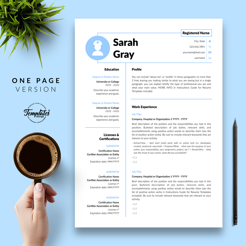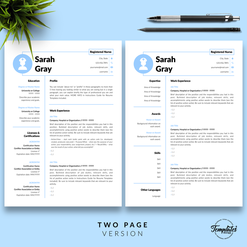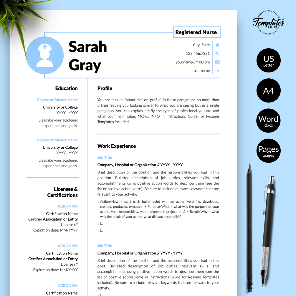“Sarah Gray” Nurse Resume CV Template for Word & Pages / US Letter & A4 Files + 1, 2, & 3 Page Resume Version + Cover Letter + References + Cover Letter with References + Fonts + Icons + Resume Writing Guide/Tips + Bonus / Instant Download