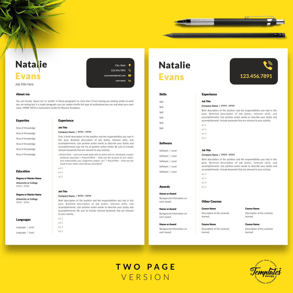 "Natalie Evans" Simple Resume CV Template for Word & Pages / US Letter & A4 Files + 1, 2, & 3 Page Resume Version + Cover Letter + References + Cover Letter with References + Fonts + Icons + Resume Writing Guide/Tips + Bonus / Instant Download